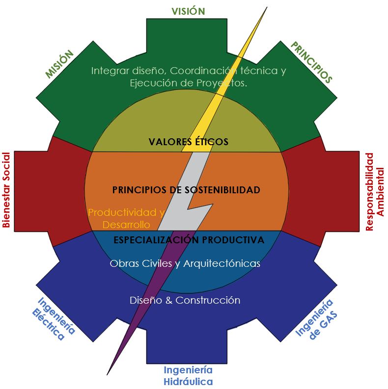 Nuestro logo proyecta la mezcla de principios corporativos, que se engranan con la misión y visión de la empresa y con su más profundo sentido empresarial: Una mezcla entre una gota de agua (Ingeniería hidráulica y de gas), un rayo de energía (Ingeniería eléctrica), una pieza dentada en 8 muescas (Nuestros valores y principios) y que gira para producir bienestar individual y colectivo.